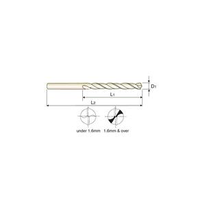 Broca 338 05,80 mm M35 Tin DLGP195058 YG-1 Geometria de Canal: Hélice à Direita Ângulo de Ponta: 135°, até 1.5mm: geometria de ponta Normal; acima de 1.5mm: afiação em cruz Tratamento de Superfície: corpo brilhante e revestimento TiN na área funcional Aplicação: Furação de Aço Inoxidável, materiais de difícil usinabilidade como ligas de titânio e inconel. D1 - Diâmetro da Broca:5.8 mm D2 - Diâmetro da Haste:5.8 mm L1 - Comprimento de Corte:57 mm L2 - Comprimento Total:93 mm D - Comprimento: Jobber