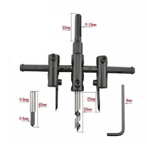 Broca em aço carbono ajustável tipo bailarina. Ideal para executar furos em madeiras, laminados, gesso, plásticos, borrachas e outros materiais moles. Utilizada principalmente para instaladores de lâmpadas dicroicas e luminárias sobre sancas de gesso.