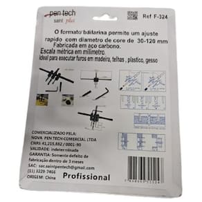 SERRA COPO BAILARINA 30MM A 120MM AJUSTÁVELCom essa serra broca bailarina você fará furos redondos perfeitos e limpos, sem complicações. Ideal para executarfuros em madeiras, laminados, gesso, plásticos, borrachas e outros materiais moles.Especificações Técnicas:• Material: Aço Carbono• Escala Métrica em Milímetro• Comprimento de 155mm• Altura de 145mm• Diâmetro de Furação: 30mm a 120mm• Profundidade Máxima do Corte de 25mModelo Bailarina AjustavelTipo de broca BailarinaTamanho da broca 120mm Marca: Pen Tech