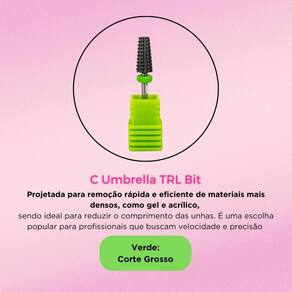 A broca de unhas C Umbrella TRL Bit de corte grosso é uma ferramenta projetada especificamente para a remoção eficiente e rápida de materiais espessos nas unhas, como gel, acrílico e polygel. Com seu formato em umbrella é ideal para realizar cortes profundos e rápidos, removendo grandes quantidades de produto de maneira eficaz, o que facilita o trabalho em processos de desmontagem e retoque de alongamentos. Fabricada em tungstênio, essa broca é resistente ao desgaste e mantém o desempenho por longos períodos. Seu corte grosso é ideal para técnicos que precisam de uma ferramenta potente para remover camadas mais densas com rapidez, garantindo também a segurança e precisão no trabalho, evitando danos à unha natural. É uma ótima escolha entre profissionais devido à sua eficiência, durabilidade e capacidade de oferecer um acabamento limpo em menos tempo.