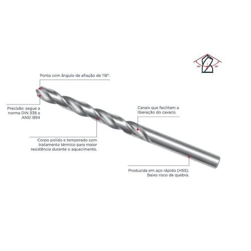 Produzida em aço rápido HSS , esta broca possui corpo polido e temperado com tratamento térmico, o que garante maior resistência durante o aquecimento. Seus canais facilitam a liberação do cavaco, evitando acúmulo e aumentando a vida útil da broca.