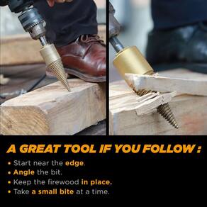 Esta é uma ótima ferramenta. utilizado adequadamente, ajudará você a economizar muito tempo. Esta broca é para dividir lenhas pequenas e divididas em pequenos pedaços de kiindling. Madeiras macias como pinheiro funcionam melhor. Não é adequado para madeira grande ou madeira verde grande (não seca ainda). Evite sempre nós. Coloque um pé ou use outras maneiras para manter a madeira no lugar e evite girar, use uma mão para segurar a alça lateral da broca, a outra mão segura a broca e começa em baixa velocidade. Leve apenas um pouco de cada vez. Comece bem perto da borda. Não perfure isso no centro. Tenha cuidado com o torque reverso. [AVISO]: Se você dirigi-lo no centro de um pedaço duro de lenha com uma furadeira poderosa, ele ficará preso e colocará você em risco de torcer mal o pulso ou definir a madeira girando. Aviso: alto torque. Use uma alça com a chave de impacto ou ela pode machucar seu pulso. Aviso: alto torque. Fixe a peça de madeira ou ela pode girar e bater em você. - [Economize seu tempo] As brocas separadoras de madeira macia da Jearx Tools são projetadas para dividir pequenas lenhas derramadas em pequenos pedaços de matar. Você pode dividir a madeira macia em pequenos pedaços de forma rápida e fácil. Isso ajudará você a economizar muito tempo! Mas observe que não é adequado para troncos, madeira dura grande ou madeira verde (ainda não seca). - [Durável] Nossas brocas separadoras de madeira macia usam aço carbono com tratamento térmico e revestimento de titânio. O tratamento térmico aumenta a força da rosca e garante que o produto não seja facilmente deformado. O revestimento de titânio não apenas torna o produto menos propenso a ferrugem, mas também aumenta a dureza da superfície, o que torna a broca mais resistente ao desgaste. - [Design exclusivo de haste soldada] Não é necessário montar e nunca se preocupe em soltar. A haste é soldada à broca para que permaneçam juntas ao inverter. E a estrutura integrada torna a vida útil do produto mais longa e não é fácil de quebrar. - [Melhor aplicação]: use um driver de impacto poderoso com uma alça lateral e defina a velocidade baixa. As brocas com fio funcionam melhor. As furadeiras alimentadas por bateria normalmente não têm energia suficiente ou você precisaria usar madeiras divididas menores. - [Dicas]: Coloque um pé ou use outras maneiras de manter a madeira no lugar para evitar a rotação, use uma mão para segurar a alça lateral da furadeira, a outra mão segura a broca e define em baixa velocidade. Pegue apenas um pouco de cada vez. Comece bem perto da borda. Não perfure no centro. Tenha cuidado com o torque reverso.