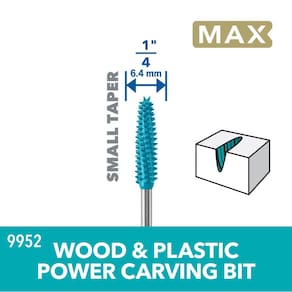 Dremel 9952 Ponta cônica pequena de 6 mm (1/4") – Ideal para aplicações de remoção e suavização em madeira, plástico, espuma e borracha - Remoção de material 2x mais rápida em comparação com Dremel 9910 - O perfil "pequeno afunilado" de ¼" de largura permite acessibilidade em áreas pequenas e difíceis de alcançar e para fazer furos profundos em sua peça de trabalho - Dentes de aço inoxidável endurecidos permitem entalhes agressivos e altas taxas de remoção de material em madeira, plástico, espuma e borracha - Linhas finas e precisas podem ser esculpidas com a ponta do 9952 - Pode remover agressivamente o material e alisar a peça de trabalho para um acabamento pronto para lixamento final