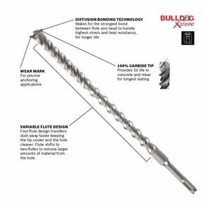 BOSCH HC2104 5/20.3 cm x 25.4 cm x 30.5 cm Bulldog SDS-Plus Broca de martelo rotativo - Processo de brasagem e endurecimento otimizado para longa vida útil - 15% mais rápido (em comparação com S4L) - Bosch A ponta de carboneto feita é mais resistente e durável sob cargas pesadas - O processo de endurecimento Bosch exclusivo resulta em mais furos por bit - Ideal para aplicações de ancoragem e furos de passagem em concreto