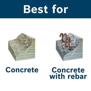 - Precisão: a ponta centrada guia a broca através de concreto duro e reforçado