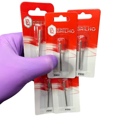 O kit contém 5 brocas diamantadas modelo PM 092 Brilho, no formato cilíndrico com ponta arredondada. Indicada para nivelamento da lâmina ungueal e acabamento próximo às pregas laterais, permite trabalhar com segurança em áreas delicadas sem risco de lesões.