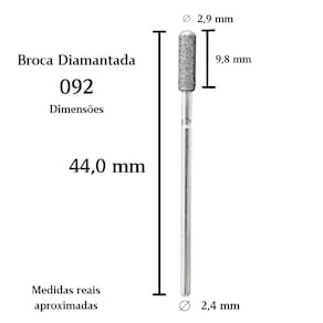 Dimensões aproximadas: comprimento total de 44,0 mm, ponta diamantada cilíndrica com 9,8 mm de altura por 2,9 mm de diâmetro e haste padrão universal de 2,4 mm.