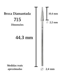 Dimensões aproximadas: comprimento total de 44,3 mm, ponta diamantada com 10,4 mm de altura, diâmetro máximo de 2,2 mm e haste padrão universal de 2,4 mm.