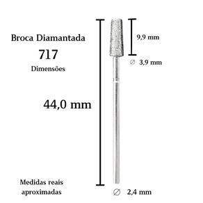 O kit contém 5 brocas diamantadas modelo PM 717 Brilho, com corpo cônico e ponta reta. São projetadas para nivelamento, polimento e redução da espessura da lâmina ungueal, oferecendo maior área de contato para desgaste eficiente e controlado.