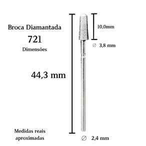 Dimensões aproximadas: comprimento total de 44,3 mm, ponta diamantada de 10,0 mm de altura, diâmetro de 3,8 mm e haste padrão universal de 2,4 mm.