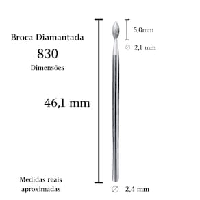 Dimensões aproximadas: comprimento total de 46,1 mm, ponta diamantada de 5,0 mm de altura, diâmetro máximo de 2,1 mm e haste padrão universal de 2,4 mm.