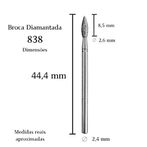 Dimensões aproximadas: comprimento total de 44,4 mm, ponta diamantada de 8,5 mm de altura, diâmetro máximo de 2,6 mm e haste padrão universal de 2,4 mm.