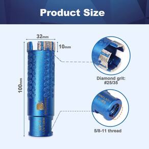 Característica: 1. Quando você estiver construindo/remodelando um banheiro ou cozinha, como instalar a torneira na bancada, você precisará fazer furos no granito sem rachá-los, para que você possa usar nossa broca de ponta de diamante para tornar esses furos muito precisos 2. Para um melhor acabamento e maior duração da broca de diamante, você pode começar em um pequeno ângulo para passar pela superfície acabada superior, então com uma leve pressão trabalhe cuidadosamente através do granito. 3. Usar esta broca de diamante em uma rebarbadora vai gostar de uma faca quente através da manteiga 4. A vida média da serra de granito depende de vários fatores, incluindo o tipo de agregado e material, sua espessura/dureza, resfriamento e uso adequados 5. Pacote: Fornecido em caixa de plástico quadrada (20-75 mm), caixa de papel (mais de 75 mm) 6. Este é o cortador de buraco de granito ideal para rocha, bricolage, trabalhadores de cerâmica, trabalhadores de construção, empreiteiros gerais e comerciantes 7. A qualidade cria uma vida melhor. Todos os nossos produtos são submetidos a rigorosos testes de qualidade. Queremos que todos os produtos sejam reconhecidos por sua qualidade e durabilidade - Tamanho -- 1 peça broca de núcleo de 32 mm (32 mm), altura do diamante 10 mm, comprimento total 100 mm, grão de diamante nº 25/35, comprimento de trabalho 80 mm, rosca 5/8-11 da broca de granito - Ampla aplicação -- A broca de diamante funciona muito bem para perfurar furos a seco através do balcão de bloco de tijolos de concreto reforçado com pedra dura de mármore de granito, usar água pode prolongar a vida útil - Matéria-prima de super qualidade - usando tecnologia soldada a laser, melhora o desempenho dos segmentos, evite segmentos desligados durante o processo de perfuração. A camada protetora de brasagem a vácuo na superfície do núcleo de aço oferece corte limpo e proteção do núcleo de aço - Perfuração rápida e suave - Cria uma perfuração rápida e estável, você pode perfurar suavemente sem bordas quebradas - Máquina -- rebarbadora (preste atenção! Se você perfurar granito grosso, recomendamos que você adicione água suficiente para ajudar a resfriar as brocas, o que pode prolongar a vida útil)
