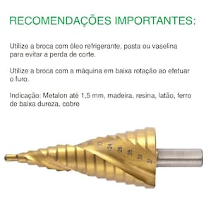 Adquira agora mesmo a Broca Escalonada Espiral Profissional Lorben e descubra a diferença que uma ferramenta de qualidade pode fazer em seus projetos. Marca: LorbenMaterial: Aço rápidoRevestimento: TitânioTipo de broca: EscalonadaQuantidade de brocas: 1 unidadeDiâmetro dos furos: 4 mm, 6 mm, 8 mm, 10 mm, 12 mm, 14 mm, 16 mm, 18 mm, 20 mm, 22 mm, 24 mm, 26 mm, 28 mm, 30 mm, 32 mmPasso 2 mmNúmero de etapas: 15Ângulo da borda externa: 118°Aplicação: Materiais de baixa dureza (Aço carbono, aço inoxidável, alumínio, cobre, latão, bronze, metalon até 1,5mm, madeira compensada, MDF, madeira aglomerada, plástico, acrílico, PVC, polipropileno, polietileno)::DICA::Utilize a broca com óleo refrigerante, pasta ou vaselina para evitar a perda de corte.Utilize a broca com a máquina em baixa rotação ao efetuar o furo.Inclui:1 Broca escalonada espiralDimensões do produto:Comprimento total: 102 mmComprimento útil: 77 mmPeso: 155 gTamanho da embalagem: 13x9x5 cmPeso da embalagem: 200 gCódigo do produto: GT6210Imagens ilustrativas. As tonalidades podem variar. Os produtos são medidos manualmente, podendo haver pequenas variações nas medidas.
