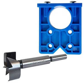 Kit de Gabarito com Broca Forstner para dobradiça em aço HSS, ideal para instalar dobradiças e outros encaixes em madeiras duras, aglomerados no segmento de móveis e carpintaria.