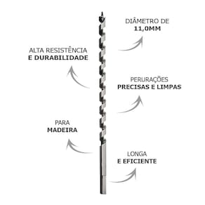 Benefícios: Perfuração rápida e precisa Alta durabilidade graças ao aço cromo Design longo para perfurações profundas Versatilidade para diversos tipos de madeira