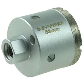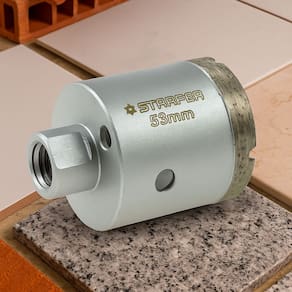 Especificações Técnicas: Tipo: Serra copo contínua diamantada Diâmetro: 53 mm Material do corpo: Aço carbono Tipo de lâmina: Contínua diamantada Rosca: M14 Compatibilidade: Esmerilhadeira (ou furadeira com adaptador Starfer) Embalagem: Blister duplo Marca: Starfer Ref.: 13006660