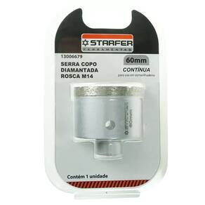 Especificações Técnicas: Tipo: Serra copo contínua diamantada Diâmetro: 60 mm Material do corpo: Aço carbono Tipo de lâmina: Contínua diamantada Rosca: M14 Compatibilidade: Esmerilhadeira (ou furadeira com adaptador Starfer) Embalagem: Blister duplo Marca: Starfer Ref.: 13006679