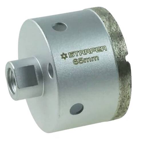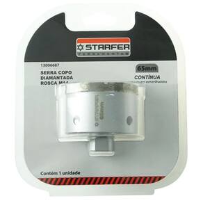 Especificações Técnicas: Tipo: Serra copo contínua diamantada Diâmetro: 65 mm Material do corpo: Aço carbono Tipo de lâmina: Contínua diamantada Rosca: M14 Compatibilidade: Esmerilhadeira (ou furadeira com adaptador Starfer) Embalagem: Blister duplo Marca: Starfer Ref.: 13006687