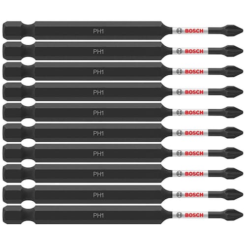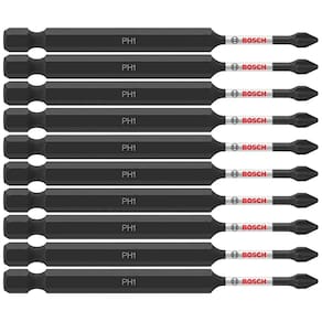 BOSCH ITPH135B Pacote com 10 brocas Phillips nº 1 para parafusamento resistente a impactos - Vida útil 10 vezes acima das brocas de impacto padrão - A zona de torção Xtended ajuda a absorver alto torque de novos acionadores de impacto - Pontas projetadas com precisão para um ajuste mais apertado e menos CAM - Fabricação com tratamento térmico para uma broca mais forte - Manga de alta visibilidade com marcações gravadas a laser para conveniência do usuário
