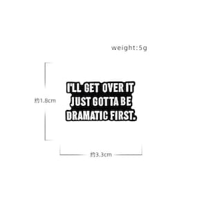 Material: Liga Tamanho: 3,3 x 1,8 cm Peso: 5 g Quantidade: você receberá todas as peças em quantidade igual à primeira foto principal. Broche de citações engraçadas e motivacionais: apresenta a frase humorística “Vou superar isso, só tenho que ser dramático primeiro”, adicionando um toque divertido à sua roupa. Design elegante e arrojado: o design minimalista em preto e branco com tipografia ousada torna este alfinete uma adição elegante a qualquer look. Material de liga durável: feito de liga de alta qualidade, este broche é feito para durar e manter seu design nítido e cores vibrantes ao longo do tempo. Perfeito para uso casual e profissional: ideal para adicionar personalidade a jaquetas, bolsas, chapéus e cachecóis, este broche complementa uma variedade de roupas. Leve e confortável: pesando apenas 5 g, este pino é fácil de usar o dia todo sem aumentar o volume, perfeito para uso diário.