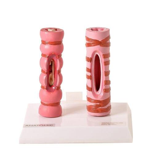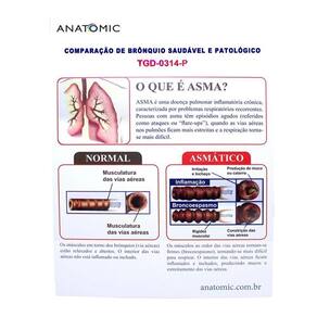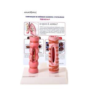 Modelo anatômico, exibe comparação entre brônquio saudável e brônquio acometido por asma, com inchaço, inflamação e secreção. Confeccionado em resina plástica emborrachada, montado sobre base com placa explicativa.