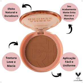O Amber Bronze é o bronzer compacto que vai te proporcionar aquele efeito bronzeado natural e luminoso, sua fórmula leve e fácil de esfumar proporciona um acabamento suave, deixando a pele com um brilho saudável e natural, perfeito para o dia a dia ou para um visual de verão.