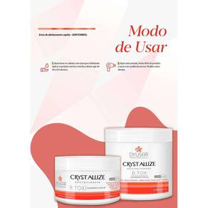Botox Crystallize. Extrato de Babosa: É rico em nutrientes com grande poder benéfico sobre o couro cabeludo, proporciona hidratação, maciez e regeneração aos fios, fortalece s fios, previne a queda capilar e cuida do couro cabeludo. Oleo de pracaxi: Cria uma camada protetora na fibra capilar, protege da umidade, controla o volume e auxilia no combate a queda capilar. Ação: Promoe ação condicionante ao cabelo úmido, aumenta o brilho do cabelo seco. Lumini System: Ativo inteligente que promove a retexturação da fibra capilar através do alinhamento dos fios, acarretando diminuição do frizz e do volume dos cabelos e aumento do brilho. Sua tecnologia permite efetiva proteção da cor dos cabelos tingidos. Ácido lático: Essa tecnologia avançada tem o poder de reforçar a fibra capilar e proporcionar uma profunda multi-reconstrução capilar até o córtex. Colágeno: Age na reconstrução da fibra capilar, proporcionando resistência a quebra dos cabelos agredidos quimicamente, deixando-os macios e com brilho o dia todo. Repõe a massa capilar. Modo de uso: Após lavar os cabelos com shampoo hidratante aplicar o produto mecha a mecha e deixar agir de 40 a 60 minutos. Após este período, retirar 80% do produto e secar com auxilio da escova. Finalize como desejar. Recauções: Uso externo. Não ingerir. Manter fora do alcance de crianças e em local fresco. Uso não recomendado em pessoas sensíveis a qualquer componente da fórmula. Em caso de irritação, suspender o uso. Evite contato com os olhos. Em caso de contato acidental, enxáguar abundantemente com água corrente. COMPOSIÇÃO: Aqua Cetearyl Alcohol Cetrimonium Chloride Glycerin Cyclopentasiloxane/dimethicone Propylene Glycol Behentrimonium Methosulfate Stearamidopropyl Dimethylamine Lactic Acid Parfum:benzyl Salicylate/Limonene/Linalool Hydroxyethyl Cetearamidopropyldimonium Chloride; Behenyl Alcohol/ Polyquaternium 55/ Cyclopentasiloxane; Dimethiconol / Ceteareth-20 Hydrolyzed Collagen Hydroxyethylcellulose Pentaclethra Macroloba Seed Oil Aloe Barbadensis Extract Disodium Edta Methylchloroisothiazolinone / Methylisothiazolinone N de Processo: 25351.510400/2020-21 Marca: Dyusar Cosmeticos
