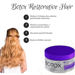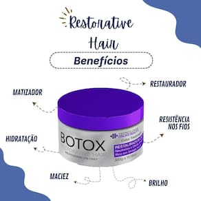 O Botox Restorative Hair contém em sua fórmula Violeta que age nos fios neutralizando o amarelado indesejado, intensificando e deixando a cor mais vibrante.