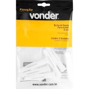 Marca: VonderConteúdo da Embalagem:1 Cartela com 6 buchas de fixação para drywallDestaques e diferenciais:Fácil aplicação e ótima resistênciaAplicações e dicas de uso:Indicada para fixações em drywallCaracterísticas Técnicas:Material da bucha: PEAD Diâmetro da bucha: 8,0 mm Espessura da placa de drywall: 4 mm a 15 mm Marca: Não Informado Ean: 7893946626945