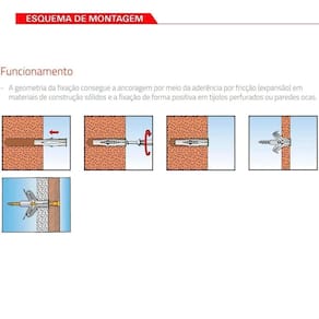 Informações técnicas: Bucha Perfix 10mm Comprimento da bucha: 60mm Profundidade mínima para furo: 70mm Diâmetro recomendado do parafuso: 5,0 - 6,3 mm Produzido em Polietileno de alta densidade Apresenta aletas e braços que fazem a bucha não girar dentro do furo.