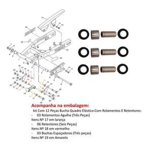 Acompanha na embalagem: Kit Com 12 Peças Bucha Quadro Elastico Com Rolamentos E Retentores: - 06 Retentores Seis Peças - 03 Rolamentos Agulha Três Peças - 03 Buchas Espaçadoras Trés peças
