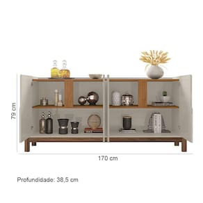 Características:Estrutura em MDF/MDPAcabamento em Pintura UV04 Portas articuladasDobradiças metálicas com Sistema Soft Close (Amortecimento)02 Prateleiras internasPés de madeiraPortas usinadas com detalhe curvoOBJETOS DECORATIVOS NÃO ACOMPANHAM O PRODUTO.Limpar utilizando apenas pano umedecido com água, nunca utilizar abrasivos ou esponjas de aço. Acompanha manual e todos os acessórios para montagem. Recomendamos que a montagem seja feita por um profissional. Garantia de 03 meses para eventuais defeitos de fabricação.Dimensões:Altura: 79 cmLargura: 170 cm Profundidade: 38,5 cmItens Inclusos:01 Buffet Lizz 170 (050518)Informações de Transporte:Peso Total: 77 Kg01 VolumeATENÇÃO, OBSERVAÇÕES IMPORTANTES.As imagens são meramente ilustrativas, não serão enviados objetos de decoração, eletrônicos e demais itens que não estejam especificados nos itens inclusos. É indispensável que seja feita a conferência do produto no ato da entrega e caso haja alguma divergência, seja feito o contato imediato com a loja e notificação no canhoto. Constatando defeito no ato da entrega o produto não deverá ser montado até tratativa com a loja. Não será efetuada a troca do produto após a montagem ter sido efetuada. A montagem é de total responsabilidade do cliente e defeitos na montagem serão tratadas como assistências. Os processos de pendências serão tratados mediante a fotos para analise e conferência da informação. As cores do produto podem variar de acordo com o seu monitor, a iluminação do ambiente em que você está e até mesmo a sua percepção visual. Não nos responsabilizamos, no ato da entrega, por subir escadas e elevadores. Eventuais despesas são de responsabilidade do cliente. Dúvidas serão tratadas via protocolo.