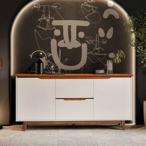 Além disso, o buffet conta com tampo e portas em MDF usinados, com acabamento refinado que valoriza os detalhes, enquanto a estrutura dos pés em madeira proporciona firmeza, durabilidade e um toque natural.
