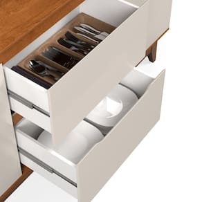 Um dos seus diferenciais é a régua dupla face, um aplique superior que pode ser montado com dois acabamentos diferentes, permitindo adaptar o visual do móvel conforme o estilo do ambiente.