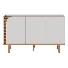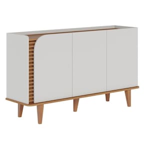 O tampo madeirado, elegantemente recuado, proporciona a sensação de uma bandeja, definindo o caráter único deste buffet. Sua base com quinas arredondadas adiciona um toque suave à estrutura. Com 03 portas de giro, o interior revela prateleiras reforçadas, perfeitas para a organização de louças.