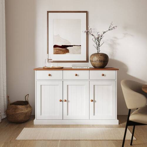 Adicione um toque de charme e organização à sua casa com este buffet versátil e robusto. Fabricado com madeira maciça, ele oferece durabilidade, combinando o clássico branco com o tampo na cor Sépia .