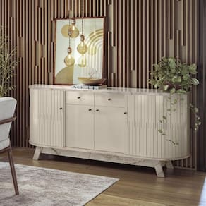 O Buffet Mônaco conta com painéis em MDP de 15 e 25mm e portas íveis em MDF, criando um visual elegante e durável. O tampo e a base com detalhes curvos, juntamente com as gavetas com corrediças telescópicas, oferecem praticidade e sofisticação. As portas com dobradiças metálicas, puxadores em poliestireno e pés palito completam o design, trazendo charme e modernidade para o seu ambiente.
