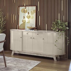 O Buffet Mônaco conta com painéis em MDP de 15 e 25mm e portas flexíveis em MDF, criando um visual elegante e durável. O tampo e a base com detalhes curvos, juntamente com as gavetas com corrediças telescópicas, oferecem praticidade e sofisticação. As portas com dobradiças metálicas, puxadores em poliestireno e pés "palito" completam o design, trazendo charme e modernidade para o seu ambiente.