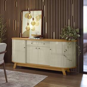 O Buffet Mônaco conta com painéis em MDP de 15 e 25mm e portas flexíveis em MDF, criando um visual elegante e durável. O tampo e a base com detalhes curvos, juntamente com as gavetas com corrediças telescópicas, oferecem praticidade e sofisticação. As portas com dobradiças metálicas, puxadores em poliestireno e pés "palito" completam o design, trazendo charme e modernidade para o seu ambiente.