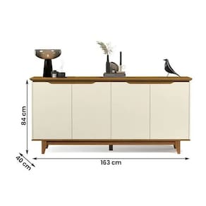 Modelo: Flow 4 Portas; Largura: 163 cm; Profundidade: 40 cm; Altura: 84 cm; Material da estrutura: MDF/MDP com pés de madeira maciça; Quantidade de portas: 04; Material de dobradiças: Metálicas; Com puxador: Não se aplica; Quantidade prateleiras: 02; Peso suportado: 35,000 kg distribuídos; Embalagem do envio: Papelão e plástico; Informações adicionais: Os objetos que ambientam as fotos não acompanham o produto; O produto será entregue desmontado; É de inteira responsabilidade do cliente a montagem do produto e/ou instalação, custos de transporte por escadas e/ou elevadores, guincho ou içamento, assim como possíveis irregularidades provenientes de manuseio inadequado; Embora o produto acompanhe o manual de montagem, verifique a complexidade antes de decidir montá-lo sozinho, recomendamos que contrate um profissional de sua confiança; Fique atento, nossas cores podem sofrer alterações dependendo do seu monitor; ANTES DE MONTAR O SEU PRODUTO, certifique-se que todas as instruções dispostas no manual, bem como todas as ferragens descritas, estejam presentes dentro da embalagem. Verifique se há alguma peça danificada, caso esteja, prestaremos a devida assistência dentro do prazo da garantia.