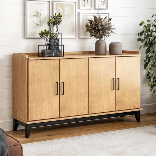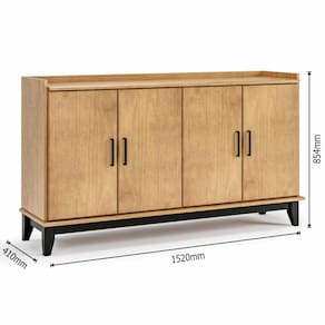 Produzido em madeira maciça de pinus de reflorestamento, o móvel oferece alta resistência e durabilidade, sendo uma excelente opção para o uso diário. Suas quatro portas com dobradiças de pressão garantem abertura prática e fechamento suave, enquanto os puxadores metálicos acrescentam um toque contemporâneo ao design.