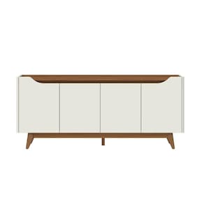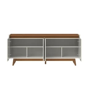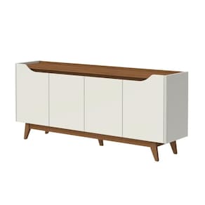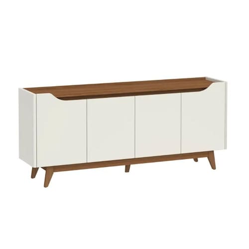 Produzido em MDF resistente, com acabamento em impressão UV de alta durabilidade, possui 4 portas com detalhes usinados, 2 prateleiras e puxadores cava, que proporcionam um visual moderno e elegante. Os pés em madeira maciça garantem robustez, estabilidade e um toque de naturalidade.