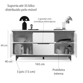 Características Gerais do Produto: - Altura: 84 cm - Gavetas: 2 gavetas com corrediças telescópicas - Ideal para: Sala/Sala de Jantar - Informações Adicionais: Acompanha base de madeira com 5 pés - Largura: 163 cm - Material: MDP/MDF - Pintura: Pintura Brilhante - Portas: 2 portas de bater - Profundidade: 40 cm - Tipo de Porta: Porta de Bater - Acabamento: Pintura Brilhante - Informações Adicionais: - Não nos responsabilizamos pela montagem dos produtos. Todos os produtos acompanham acessórios para que sejam montados. - Não nos responsabilizamos, no ato da , por subir escadas/elevadores ou por guincho em apartamentos. - Eventuais despesas são de responsabilidade do comprador; - Confira as dimensões deste produto e certifique-se de que passará normalmente por supostos elevadores, portas, escadas e/ou corredores de sua residência; - Não aceitamos de produtos com caixas violadas ou materiais danificados, confira a quantidade de volumes e se o que está sendo entregue corresponde com a mercadoria adquirida, não aceitamos após o prazo de arrependimento de 7 dias corridos.