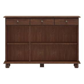 As portas e gavetas possuem puxadores metálicos, no estilo botão, na cor ouro envelhecido, combinando com sutileza com o restante do móvel.