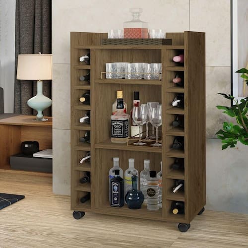 O grande diferencial deste móvel está em sua multifuncionalidade: ele funciona como buffet, aparador, bar e adega ? tudo em um só produto. Conta com nichos organizadores para garrafas de vinho ou bebidas diversas, prateleiras para utensílios e rodízios que facilitam o deslocamento, mesmo em ambientes menores.
