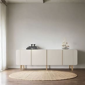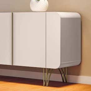 Observações: Buffet com cantos arredondados e amplo espaço interno; 04 portas com dobradiças laterais e puxadores em alumínio com acabamento dourado; Sistema de amortecimento para portas, proporcionando um fechamento suave e silencioso; Pés em aço maciço 3/8 com acabamento em tom dourado; Produzido em MDF e MDP de 15mm;