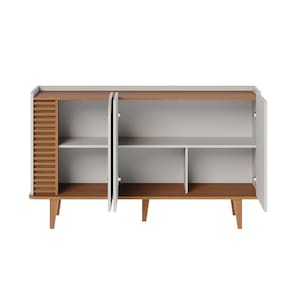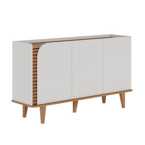 Encante-se com o Buffet Jurerê, uma combinação perfeita de design retrô e contemporâneo, evidenciada pelos seus cinco pés de madeira maciça e linhas orgânicas. Ele se destaca pelos apliques ripados realçados pela porta de quina usinada. O tampo amadeirado, elegantemente recuado, proporciona a sensação de uma bandeja, conferindo um caráter único ao buffet. Sua base com quinas arredondadas adiciona um toque suave à estrutura. Com três portas, o interior revela prateleiras reforçadas, ideais para a organização de louças. CARACTERÍSTICAS TÉCNICAS: - Produzido em MDP de 12 e 15mm, MDF de 15mm e HDF3mm - Acabamento Fosco com Pintura UV - Portas com Dobradiça Metálica - Detalhe Curvo e Ripado Artesanal de 20mm de profundidade - Tampo Estilo Bandeja - Pés em Madeira Maciça com 17,5cm de Altura - Peso Suportado no Tampo de 20kg - Peso Suportado por Prateleira de 5kg - Possui 3 Portas e 2 Prateleiras INFORMAÇÕES TÉCNICAS: Altura: 79,2cm Largura: 136cm Profundidade: 39,3cm Peso: 35,4kg ITENS INCLUSO: - Buffet Aparador - Manual de Montagem - Kit de Ferragens INFORMAÇÕES ADICIONAIS: - Não realizamos a montagem do móvel e não nos responsabilizamos por ela. Verifique o produto antes de montá-lo. Produtos danificados na montagem não serão trocados. Montagem e instalação são por conta do comprador. - As imagens decorativas são ilustrativas e podem conter itens não inclusos. As cores do produto podem variar conforme o monitor, iluminação ou percepção visual. - Limpeza: Use um pano macio e seco ou levemente umedecido com água. Não utilize materiais abrasivos como palha de aço ou objetos cortantes. Garantia de 3 meses contra defeitos de fabricação conforme o Código de Defesa do Consumidor.
