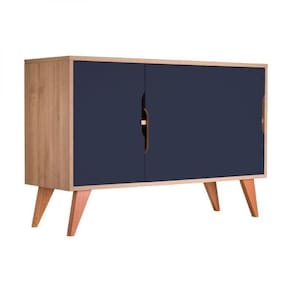 Possui dois compartimentos internos divididos por uma prateleira e 3 portas cor Azul Marinho, conjunto apoiado em lindos pés torneados em madeira maciça.