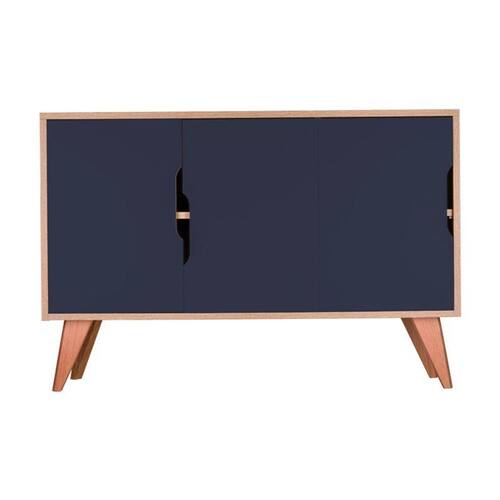 Possui dois compartimentos internos divididos por uma prateleira e 3 portas cor Azul Marinho, conjunto apoiado em lindos pés torneados em madeira maciça.